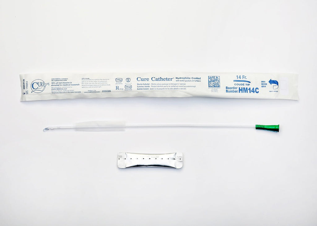 Cure Medical Male Hydrophilic Intermittent Catheter with Coude Tip 14Fr, 16" L, Single Use, Sterile, Latex-Free